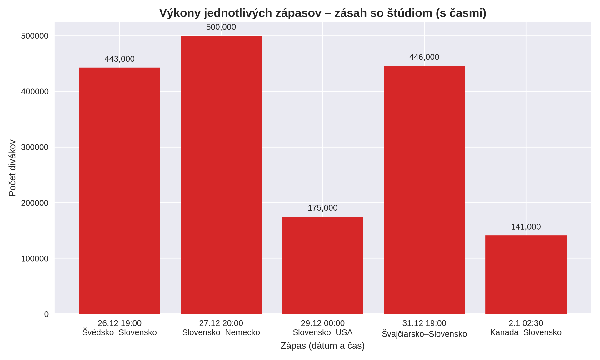 Najväčší zásah zaznamenal duel proti Nemecku — 500-tisíc divákov so štúdiom. Záverečná tretina tohto stretnutia bola najsledovanejším športovým momentom sviatkov — zásah 395-tisíc divákov.